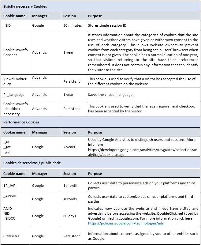 Persistent cookies: these cookies remain on a user’s device for the period of time specified in the cookie. They are activated each time that the user visits the website that created that particular cookie.