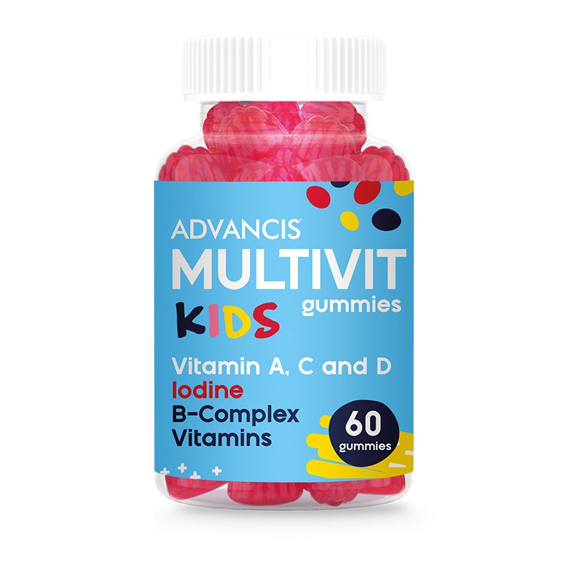 Advancis® Multivit Kids Gummies is a food supplement. Should not be used as a substitute for a varied and balanced diet and a healthy lifestyle. Vitamin D contributes to the normal functioning of the immune system and is necessary for the normal growth and development of children's bones. Iodine contributes to the normal growth of children. One daily dose of Advancis® Multivit Kids Gummies provides the recommended daily dose for producing the beneficial effects claimed for Vitamin D and Iodine.