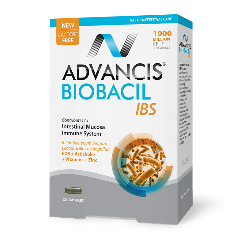Advancis® Biobacil IBS is a food supplement in capsule form with Microbial strains, Artichoke and Vitamins and Minerals. Specifically developed for people suffering from IBS with associated symptoms.